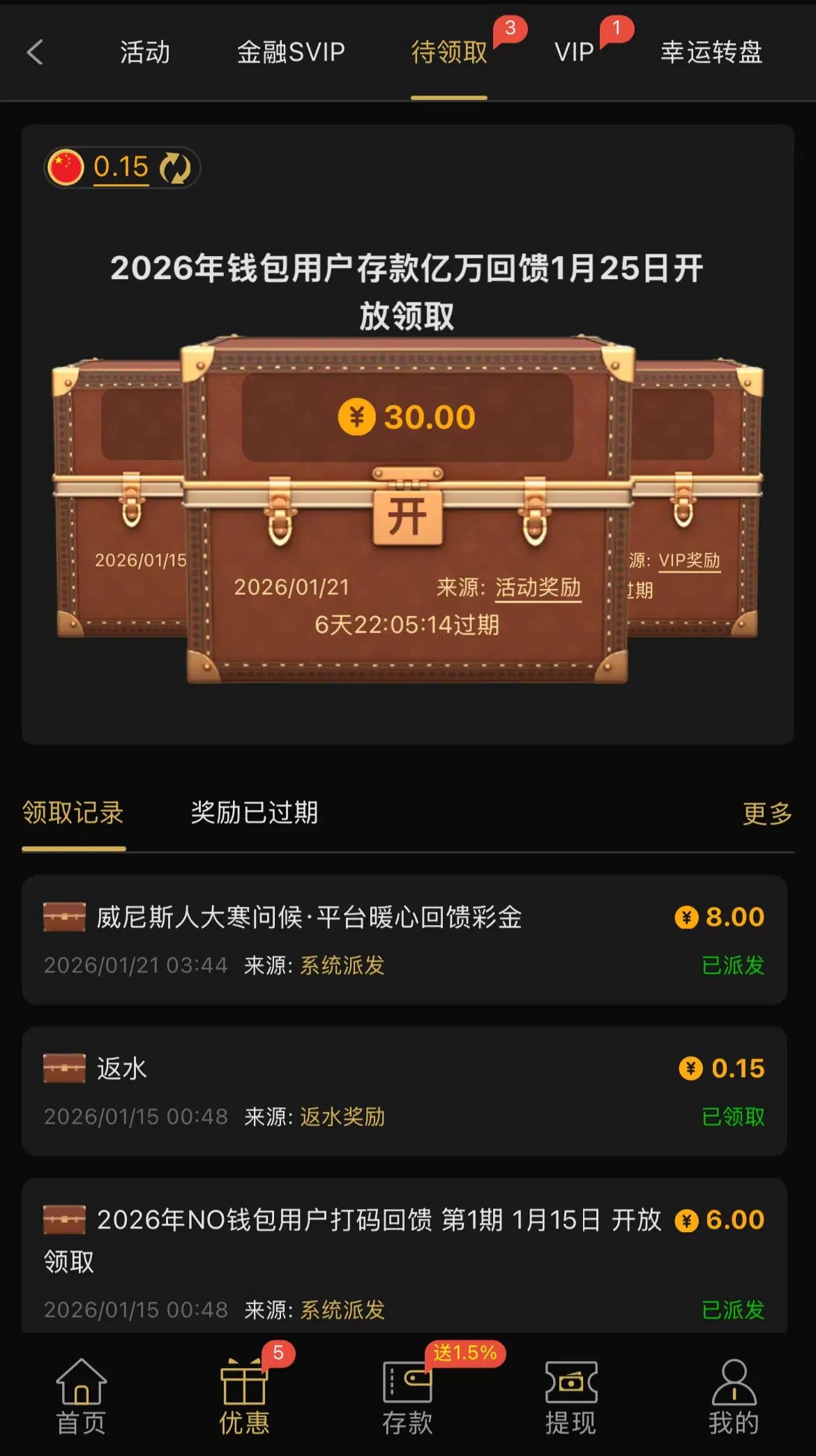 有历史充值过的兄弟看看优惠里有没有彩金领取