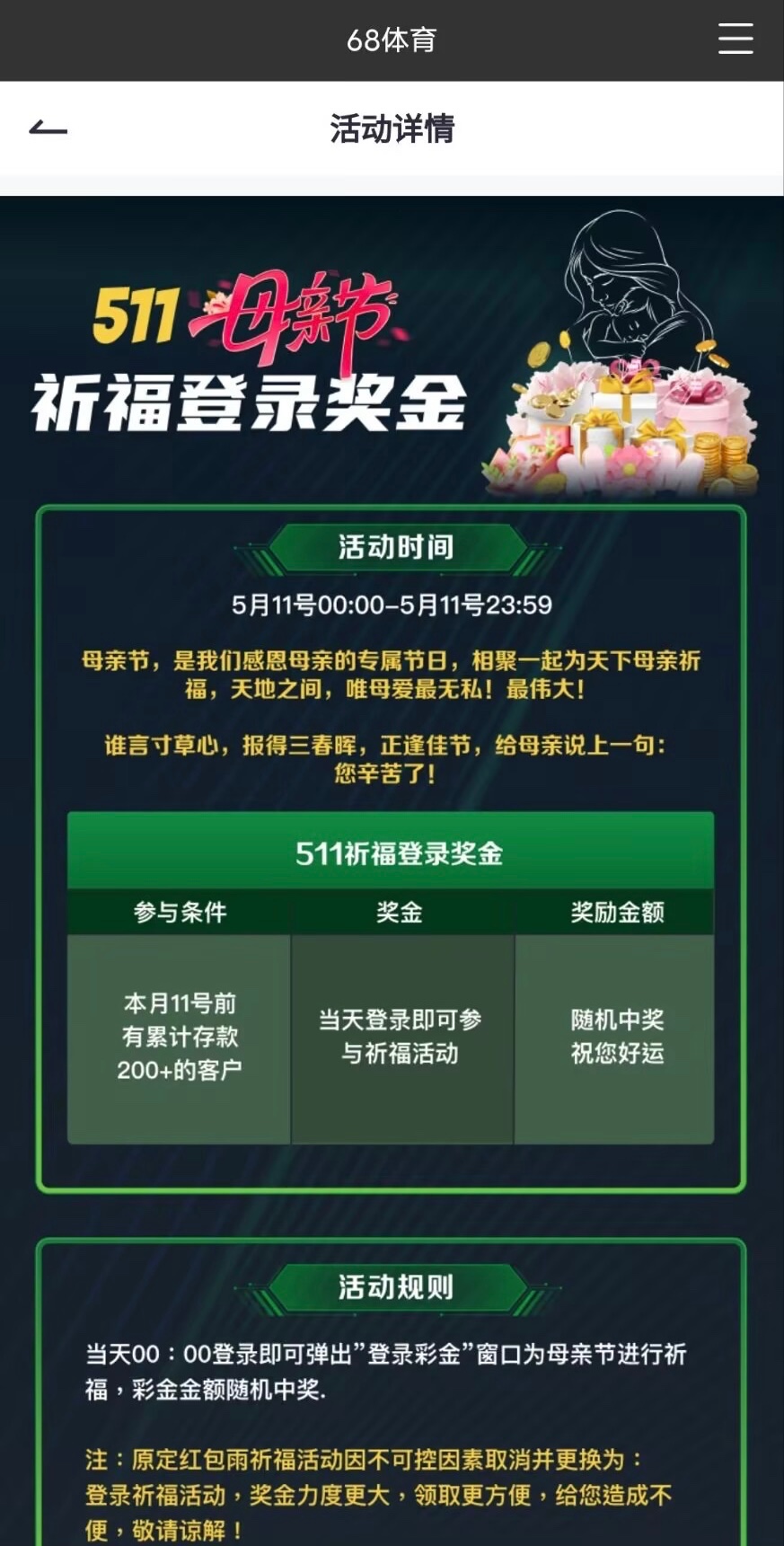 【68体育】—✅—母亲节彩金