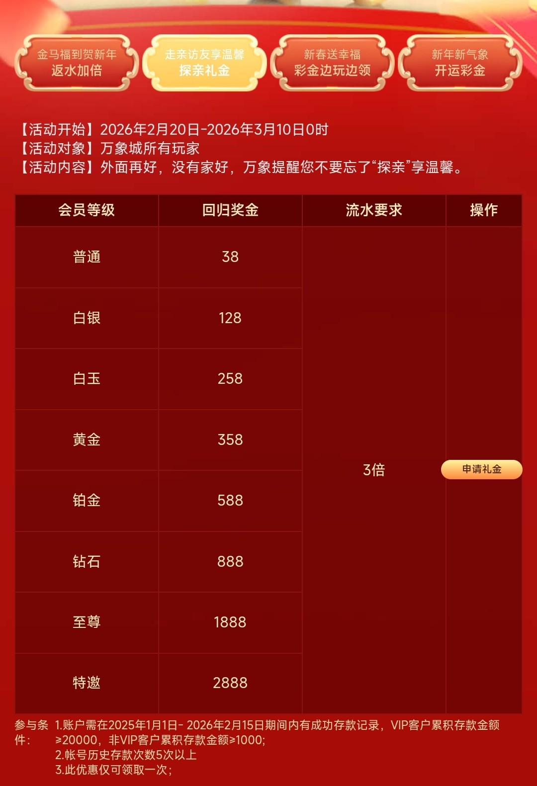 拜年红包登入上账号在看福利中心里有没有,回归彩金要去年1月1日到今年2月15号有充值才能申请领取,送多少彩金是根据会员等级派送的,3倍流水取款
